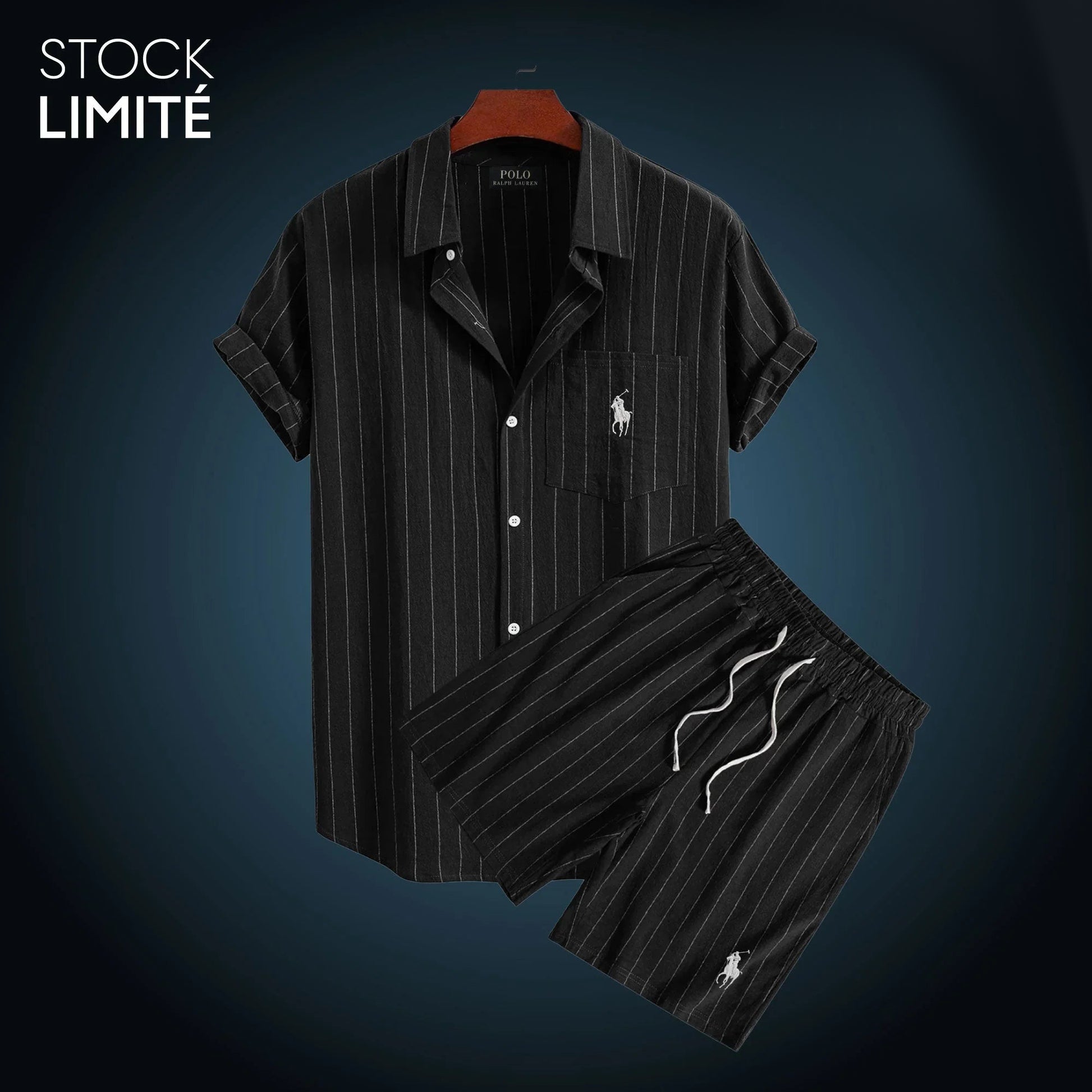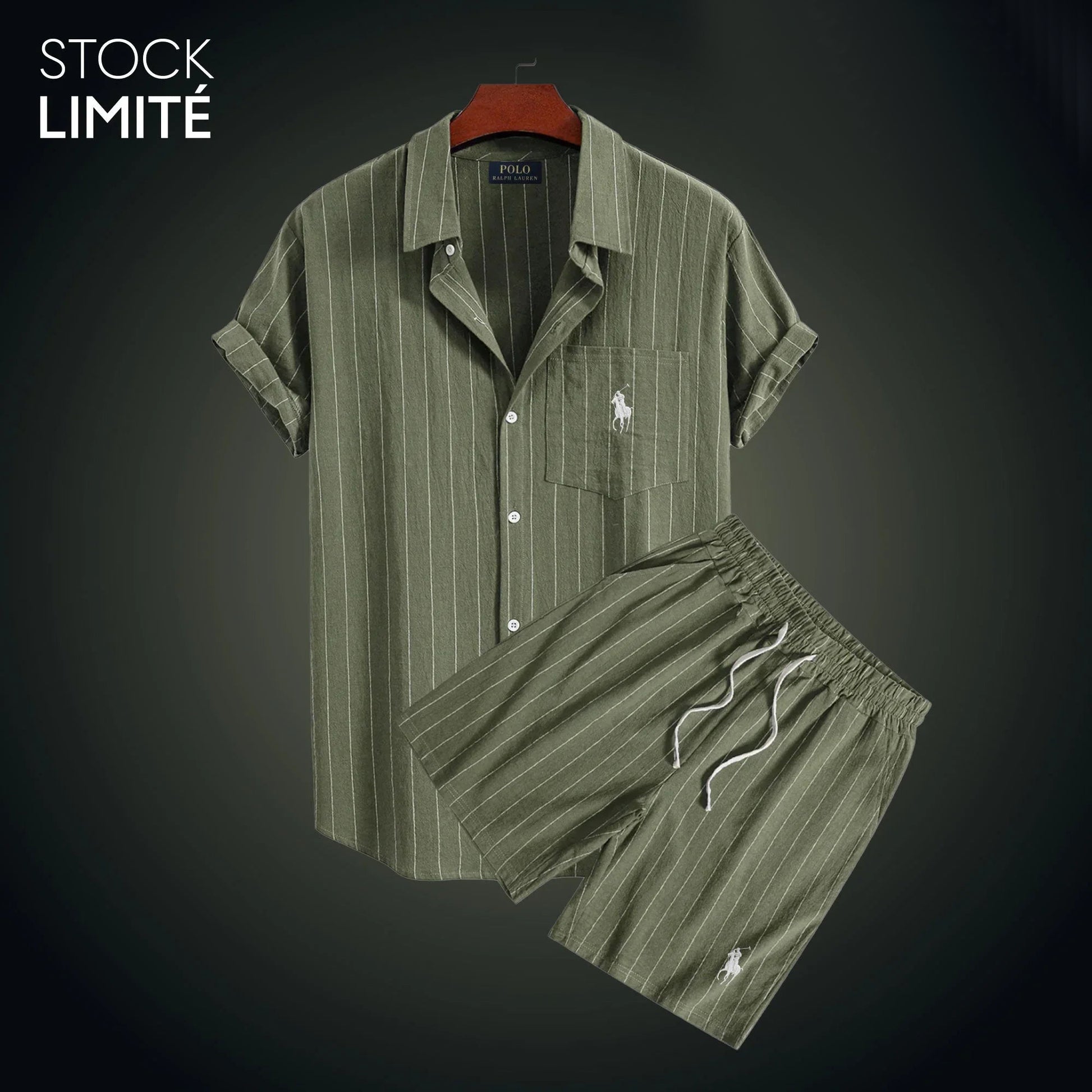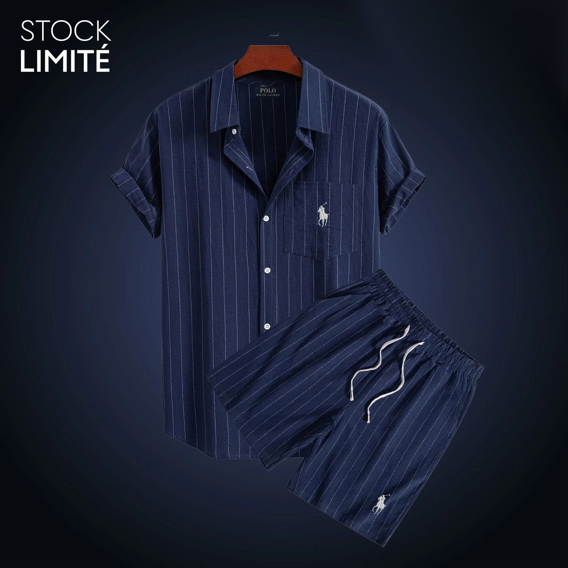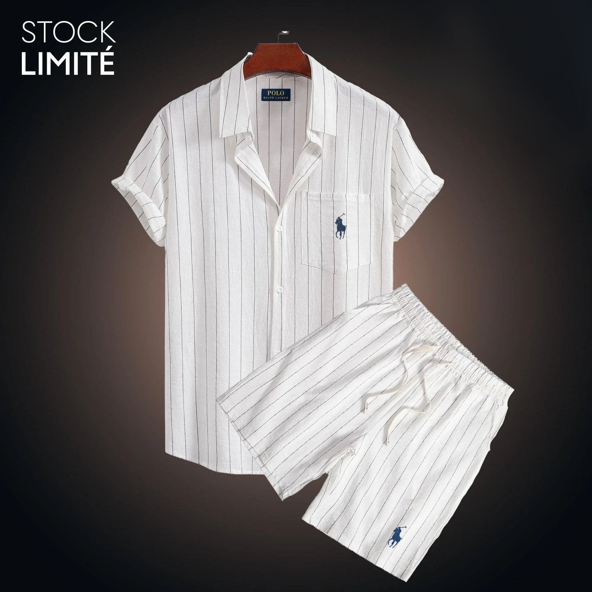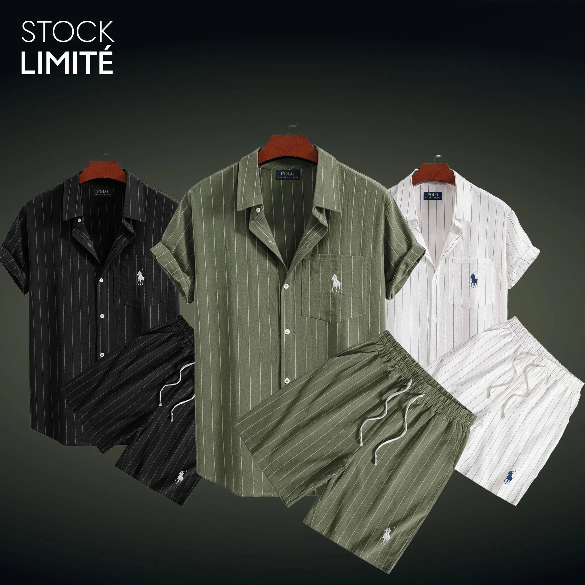 Each set features a striped short-sleeved shirt and matching lightweight shorts, crafted with subtle embroidery and meticulous attention to detail.